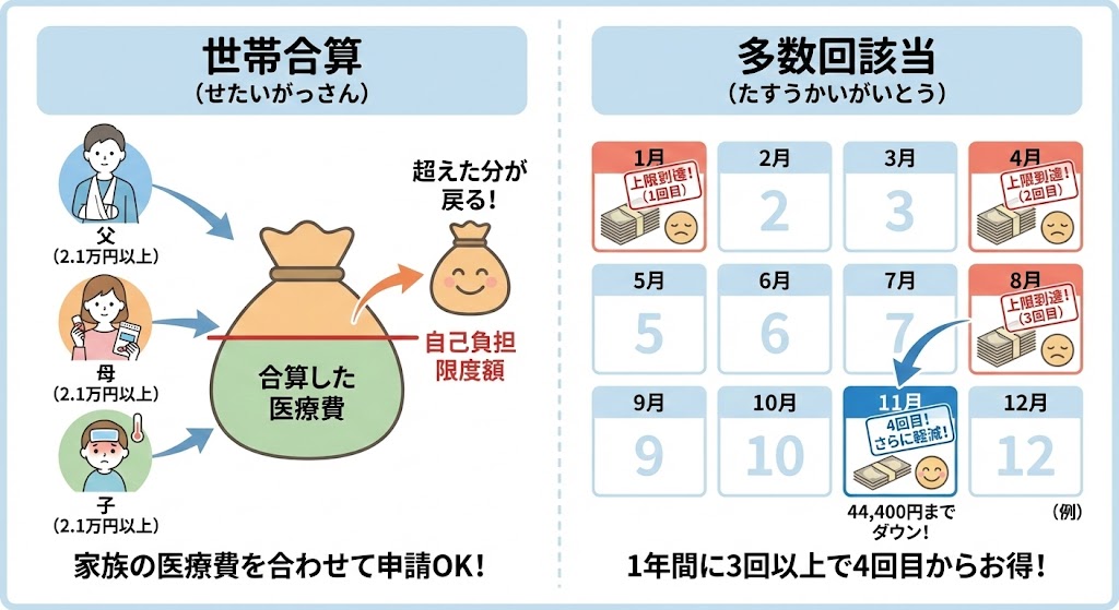 - 世帯合算: 一人では上限を超えなくても、同じ世帯の人が同じ月に払った医療費(21,000円以上)を合算して申請できます。